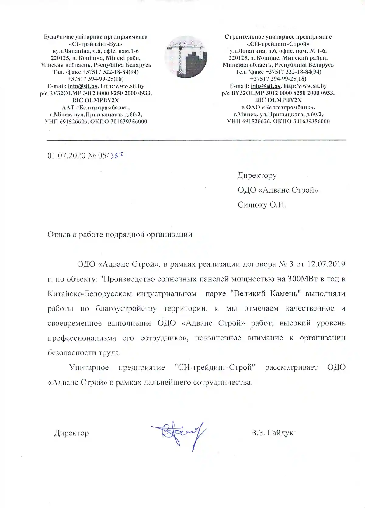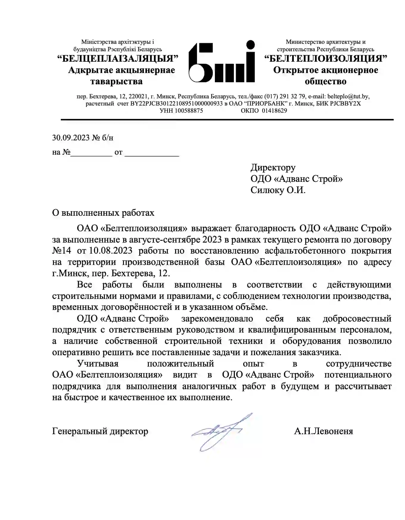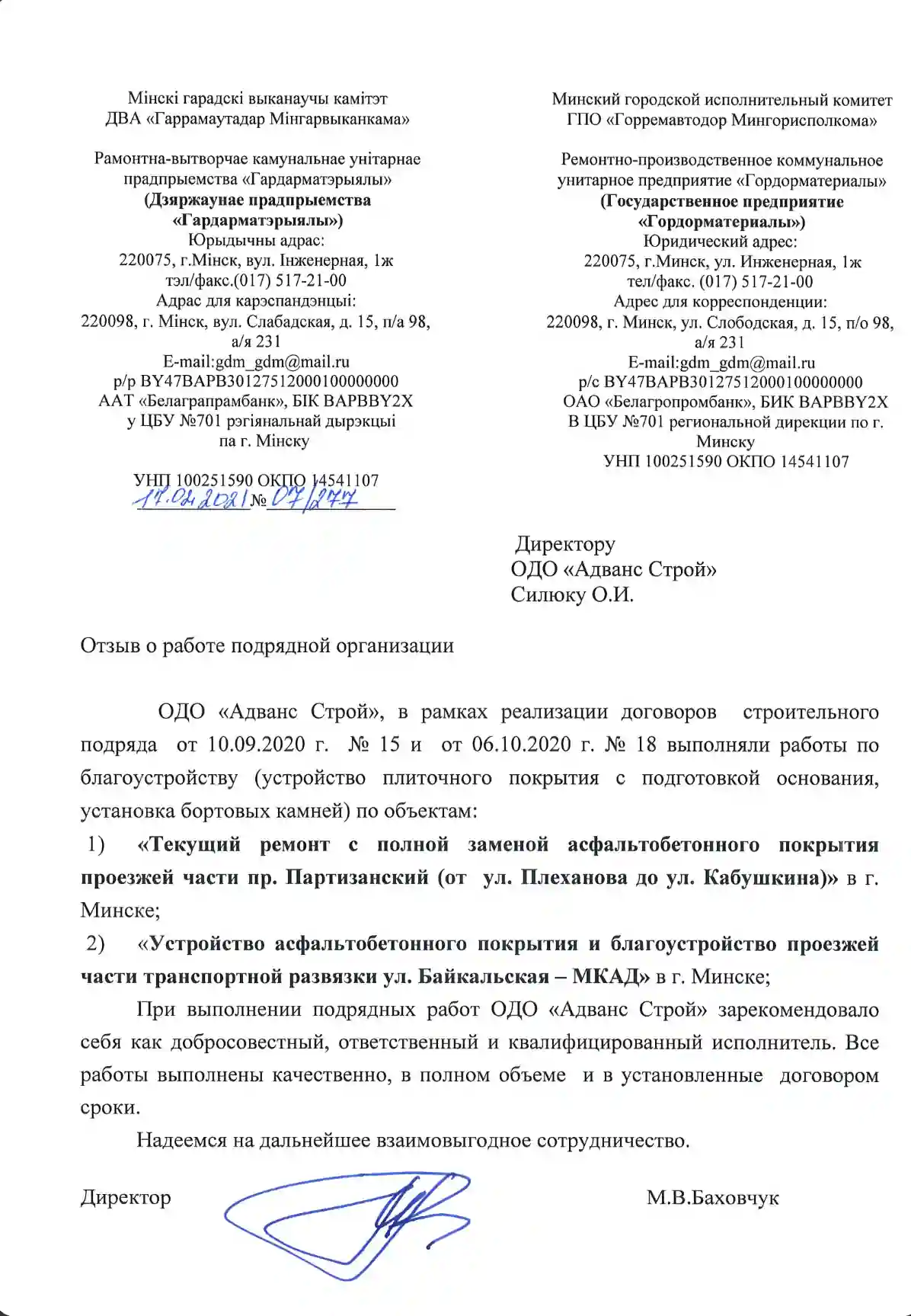 ОДО «Адванс Строй» — дорожная компания в Минске, выполняем дорожные работы под ключ: асфальтирование, ямочный ремонт, устройство покрытий из асфальтобетона, асфальтогранулята и крошки, цементобетонные покрытия, подготовка оснований (песок, щебень, гравий). С 2009 года работаем по Минску и Минской области, соблюдаем технологии и сроки. Кроме того, даем гарантию на выполненные работы и предоставляем полный комплект закрывающих документов