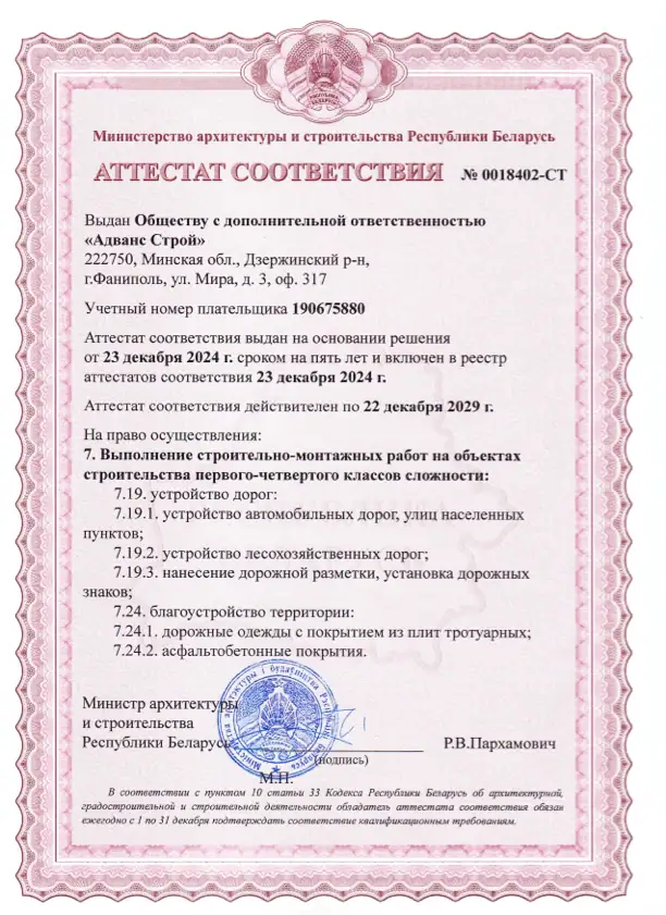 ОДО «Адванс Строй» выполняет дорожные работы в Минске и области, такие как подготовка оснований, укладка асфальтобетона, покрытия из асфальтогранулята и крошки, цементобетонные решения, ямочный ремонт. Выезжаем на объект для обследования, подбираем «пирог» с учётом нагрузки (парковка, проезд, склад), согласуем сроки и организуем полный цикл — от демонтажа и вывоза до сдачи по акту. Собственный парк техники, а так же и отлаженные процессы помогают держать сроки без простоев, а технологический контроль на каждом этапе обеспечивает долговечность покрытия. Работаем по договору, предоставляем гарантию 5 лет. Оставьте заявку — предложим несколько вариантов решения под ваш бюджет и срок службы.
